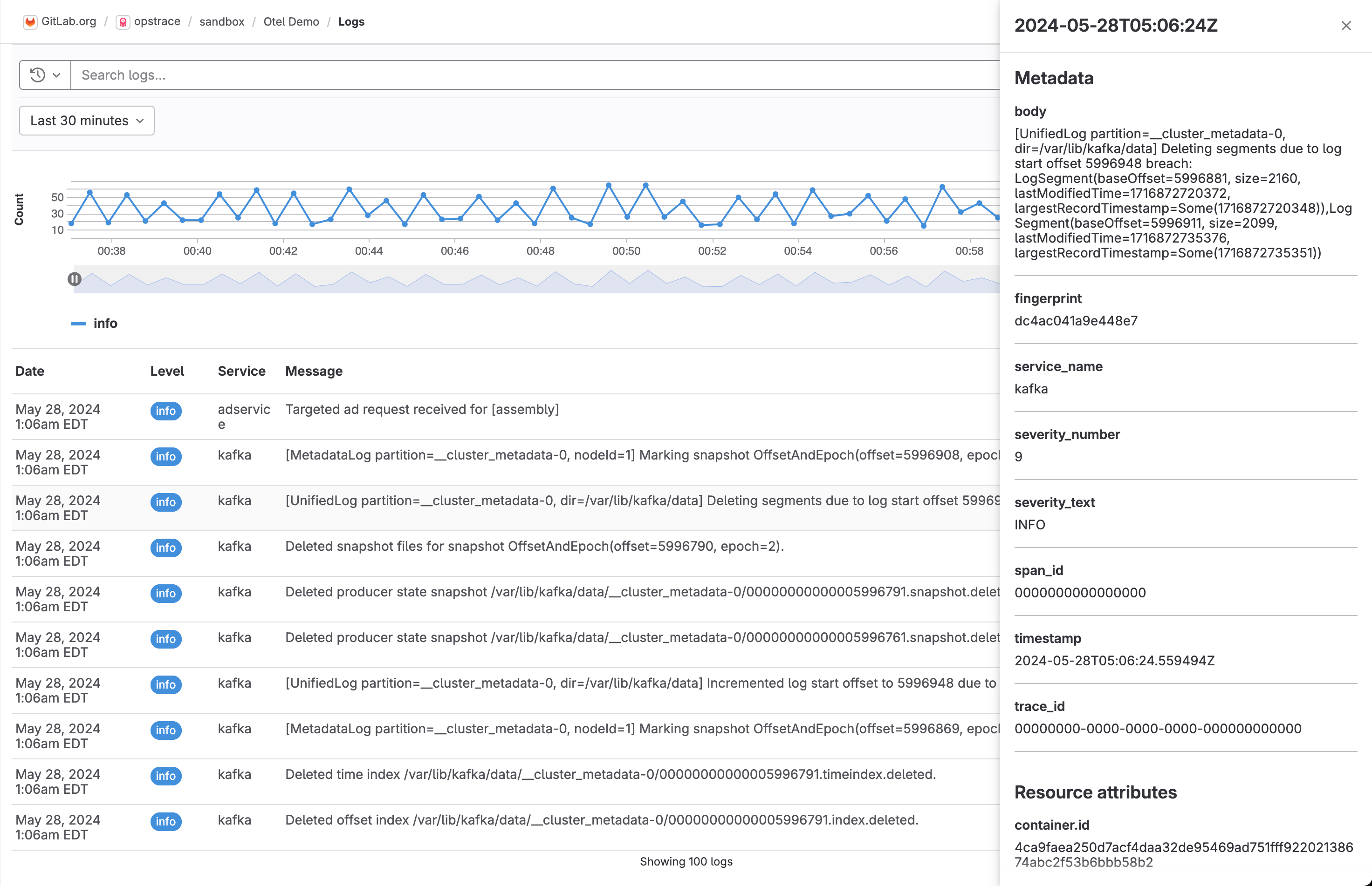 Logs are configured for your project. When you run your application, the OpenTelemetry exporter sends logs to GitLab.
