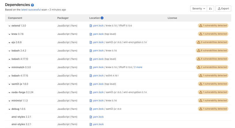 Details of each dependency are listed, sorted by decreasing severity of vulnerabilities (if any). You can sort the list instead by component name, packager, or license.