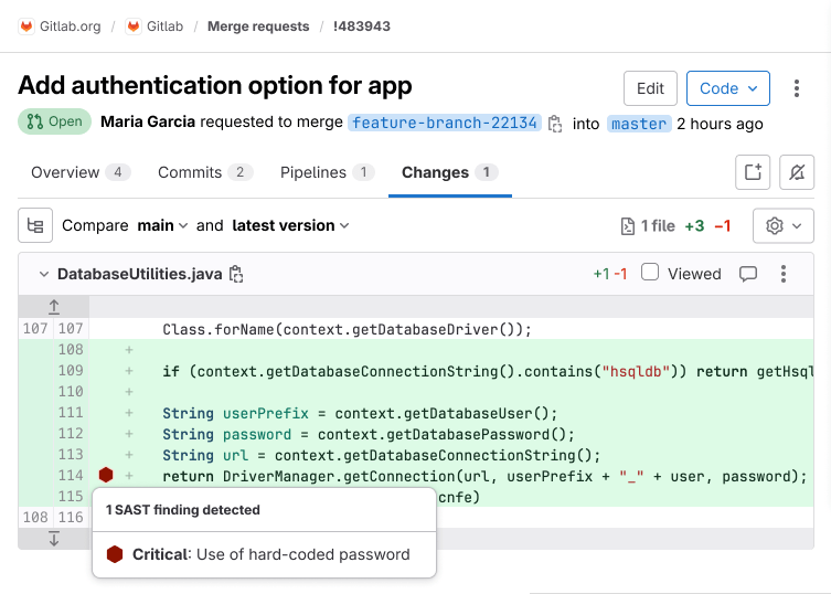 | New findings in merge request changes view | {dotted-circle} No | {check-circle} Yes |