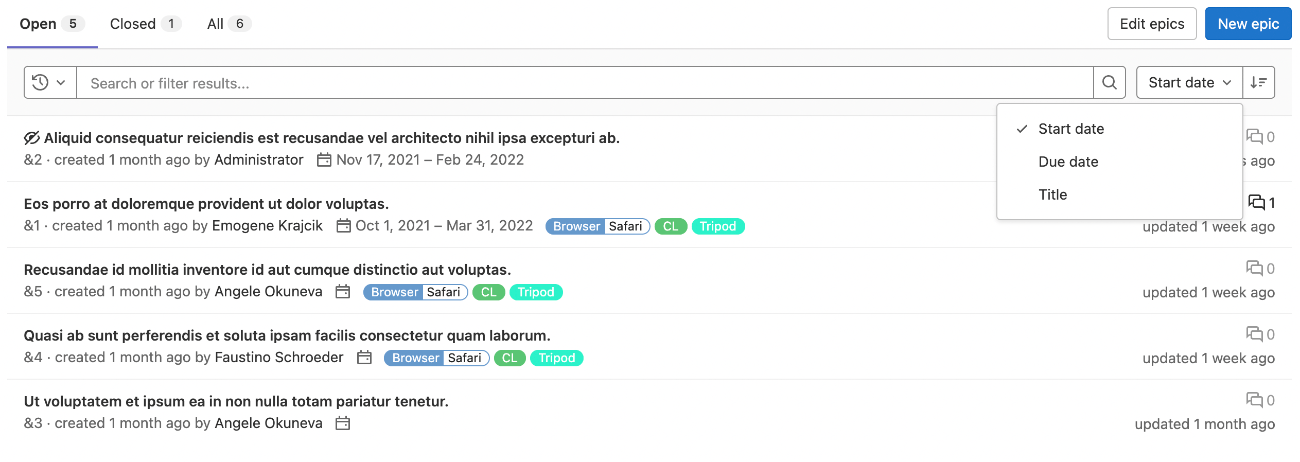 - For the start date: GitLab scans all child epics and issues assigned to the epic, and sets the start date to match the earliest start date found in the child epics or the milestone assigned to the issues.